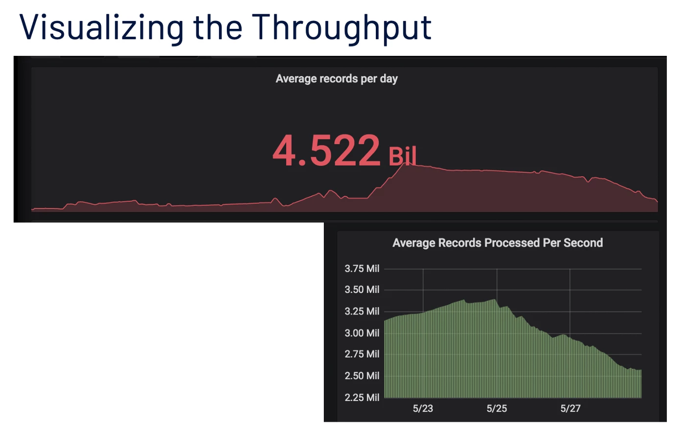 The techniques described above helped us scale our post-ingestion streaming pipeline and we were able to achieve consistent peak throughputs exceeding a million records a second consistently with no manual intervention during heavy traffic peaks. As the following figure indicates, currently we process around 4 billion messages a day with multiple peaks in the day. We also show the trend of the average number of records processed per second peaking around the 3.2 million mark after having incorporated the techniques discussed above.