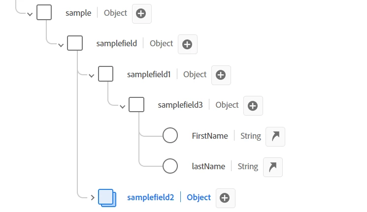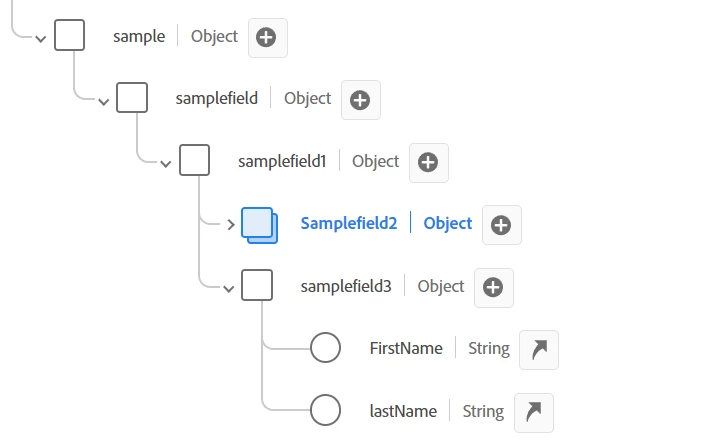 If you want to add samplefield 2 on the same level as samplefield 1 then click on the + icon in front of samplefield and add a field but if you want to add it at the same level as samplefield 3 then click on + icon in front of samplefield1.
