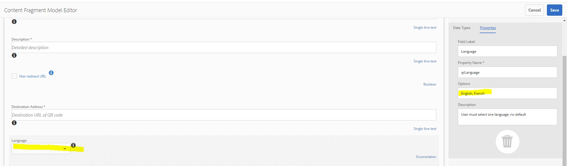 How to add default value to a drop down field in a content fragment model