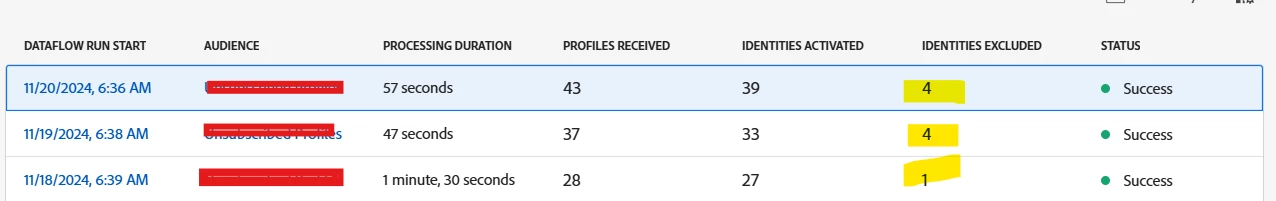 We have a destination export dataflow on a segment that runs everyday which sends the incremental data to a SFTP location. We are using first name, last name, member number and email id in the mapping. Now everyday there are some profiles (around 10%) that are getting excluded from the export. We want to know the details of the profiles that are getting excluded in everyday's run as well as the reason behind it.