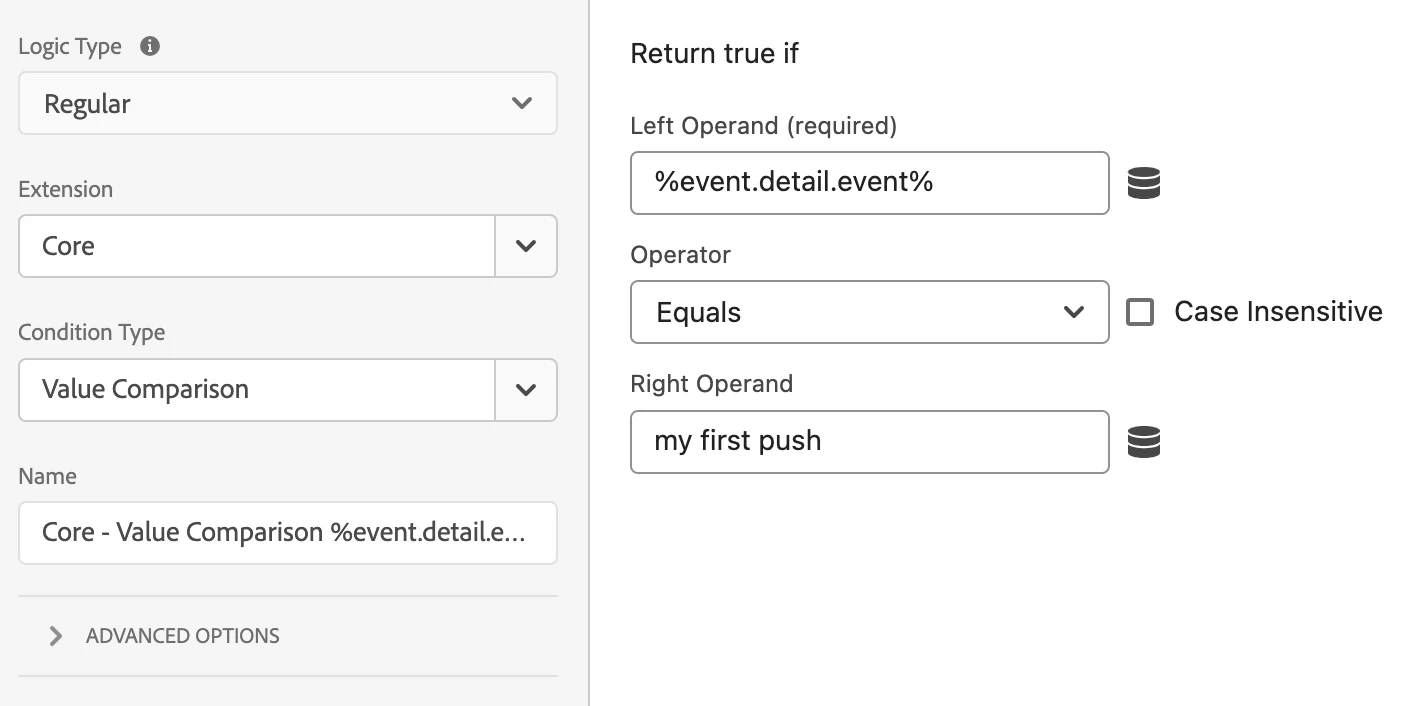 - Name: Core - Value Comparison %event.detail.event% equals "my first push"