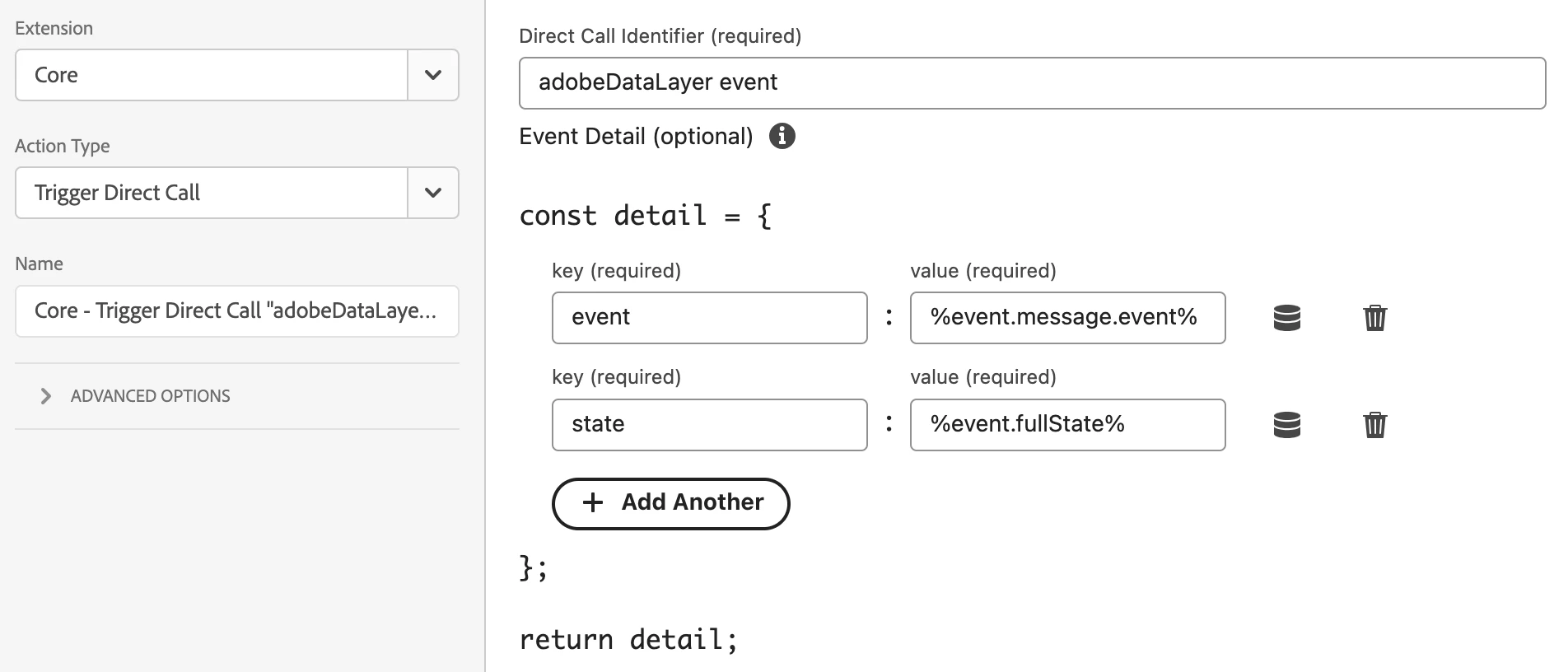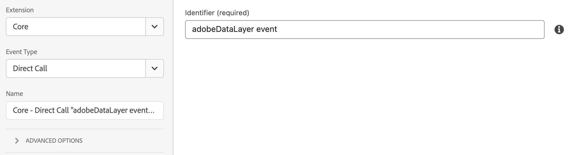 - Name: Core - Trigger Direct Call "adobeDataLayer event"