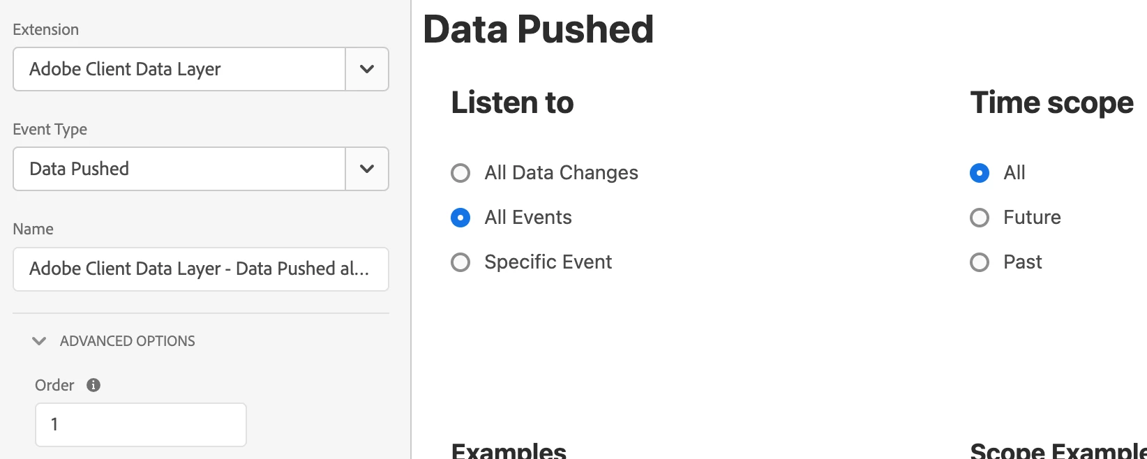 - Set the Adobe Client Data Layer extension's Data Pushed event to be of order 1. This ensures that the Rule gets triggered before any other Data Pushed events.