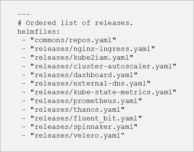 Helmfile allows us to deploy helm charts within Kubernetes. A helm chart is simply a collection of files that describe a related set of Kubernetes resources. We start with a basic helmfile structure, inspired by Cloud Posse’s GitHub repository, in which we have a main helmfile that contains a list of releases (helm charts) that we want to deploy.
