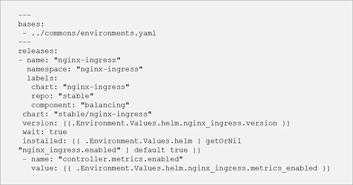 Each release file in the list is basically a sub-helmfile. The code snippets below provide an example of what the file would look like for the load-balancing tool, the NGINX Ingress Controller.