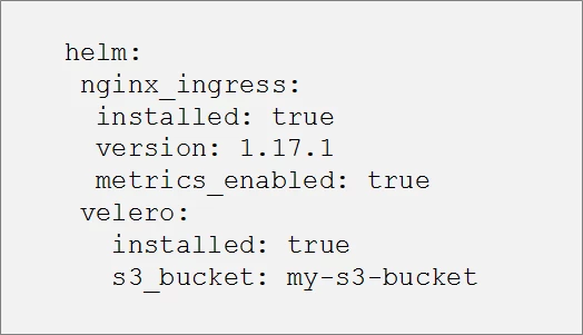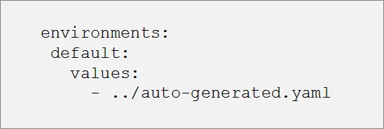 The ability to create a template is particularly useful when there are multiple charts that are common across different clusters. Templatizing the helm deployment avoids the need to duplicate the code in every cluster allowing us to instead encapsulate the code into a single file and apply it to the helmfile. The resulting auto-generated.yaml is a simple yaml file containing the following values: