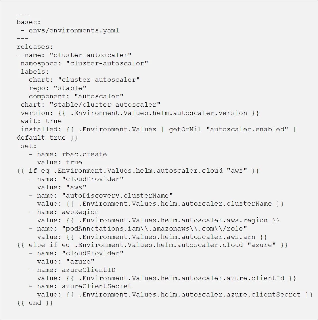 One of the most interesting helmfile features is the ability to use templatization for the helm chart values (a feature that helm lacks). Everything we see in the helmfile can be templatized. Let’s take the cluster-autoscaler for example. Suppose we want to deploy this chart in two Kubernetes clusters, one that is located in AWS and one in Azure. Because the cluster-autoscaler hooks to the cloud APIs, we will need to customize the chart values based on the specific cloud provider in which the cluster is located. For example, AWS requires an IAM role while Azure needs an azureClientId and azureClientSecret.
