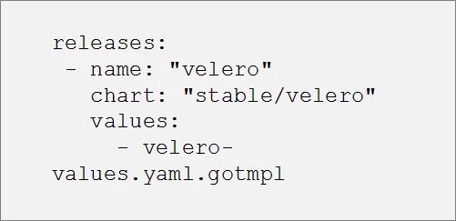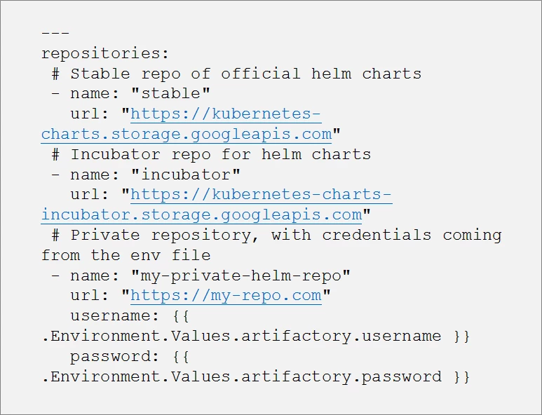 We can also define a list of helm repositories from which we want to fetch the helm charts. The stable repository is an obvious choice, but we can also add our own private helm repositories. And, with helmfile’s support for injecting environment secrets to protect access credentials, we can use templatization in order to automatically provide the necessary credentials to run the application: