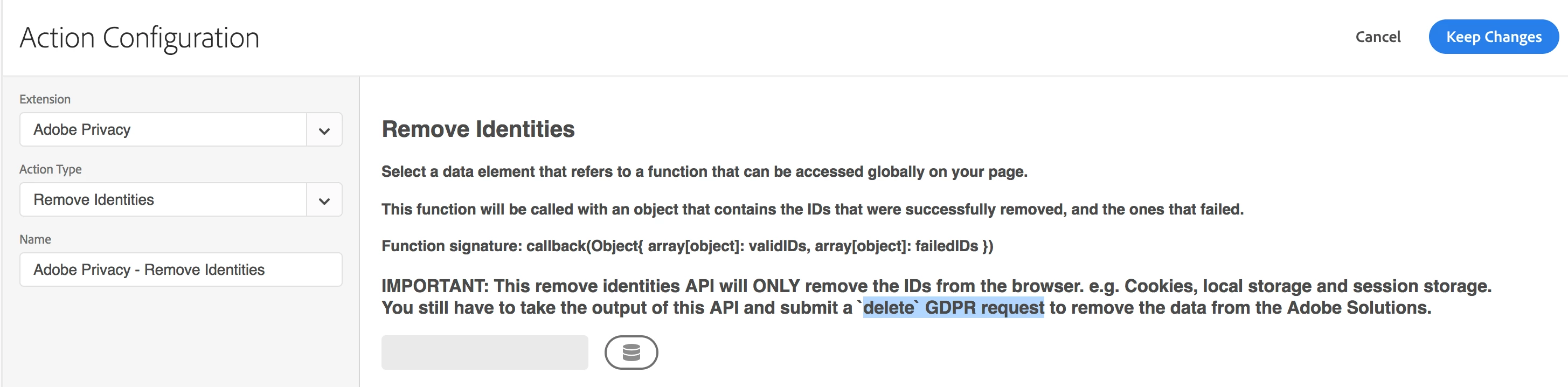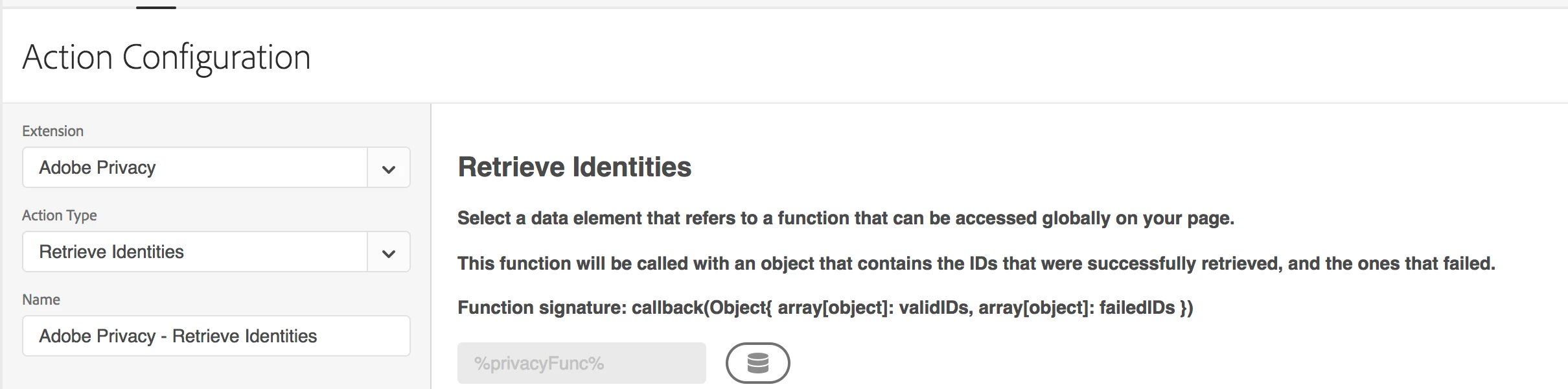 I'v managed to get adobePrivacy.js working outside of DTM/Launch, just using straight-up javascript, but I haven't worked out how to do it using the Launch Privacy extension. Specifically, I'm not sure what I need to do with Data Elements to Retrieve/Remove Identities. The interface is less-than-clear: