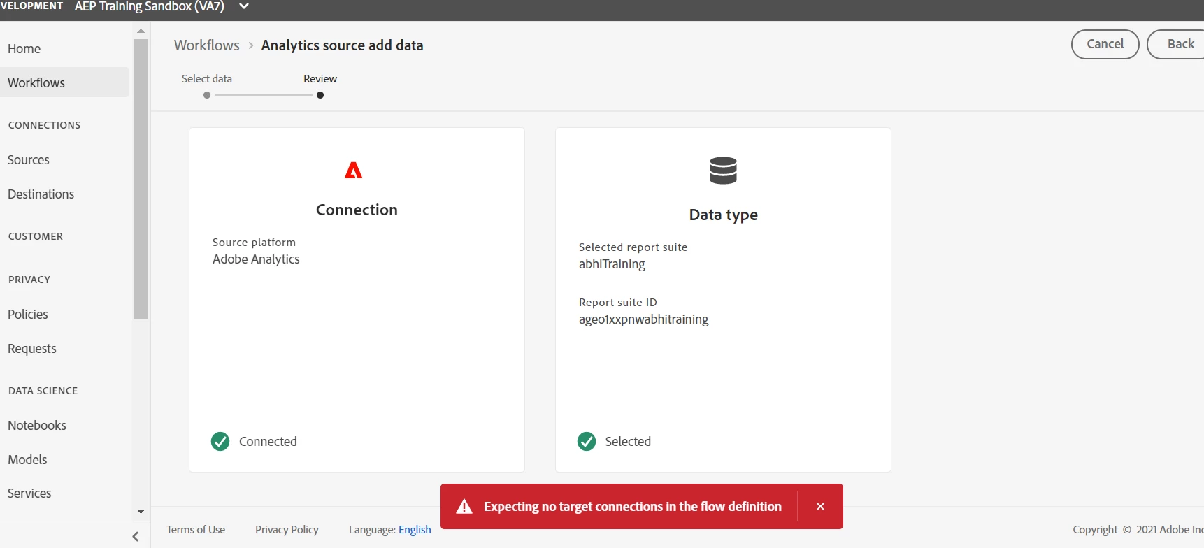 I want to use adobe analytics as sources in AEP but getting error while trying to connect it.