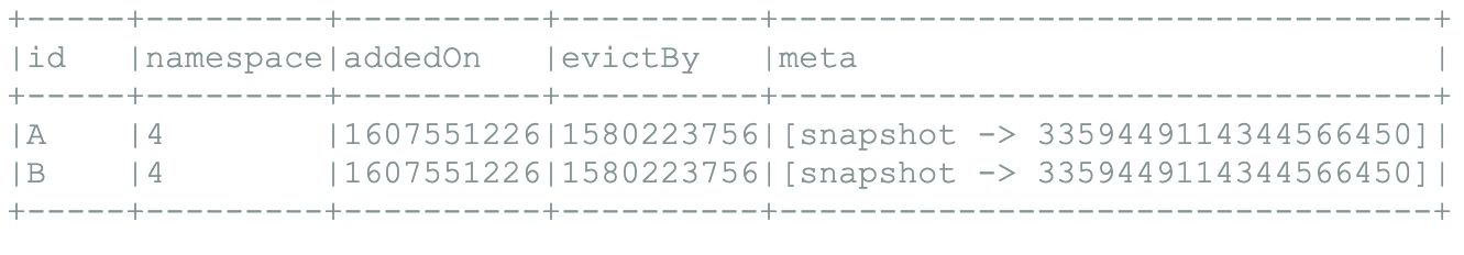 "tombstone.metrics.total.count" -> "158"We store the tombstone metrics in the snapshot summary along with the path to the Avro file that contains active tombstones. A tombstone snapshot is specifically generated for a vacuum operation. Here is an example: