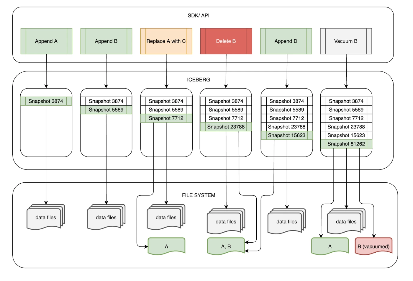 You can think of Iceberg as software that for each data change you make COMMIT it will create a new and immutable table VERSION containing the correct data files reflecting your change as well as the history of previous data changes SNAPSHOTS.