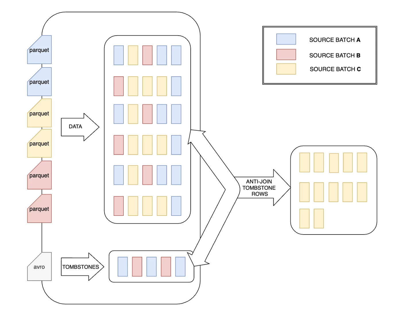 In the context of Iceberg, a tombstone metadata file is a specific file that is stored alongside standard snapshot metadata. At a low level when the SDK reads the data we also perform an “anti-join” operation between the data and the available tombstones available for that same snapshot. The anti-join operation will effectively prune the soft-deleted rows and the result is the correct view of the data.