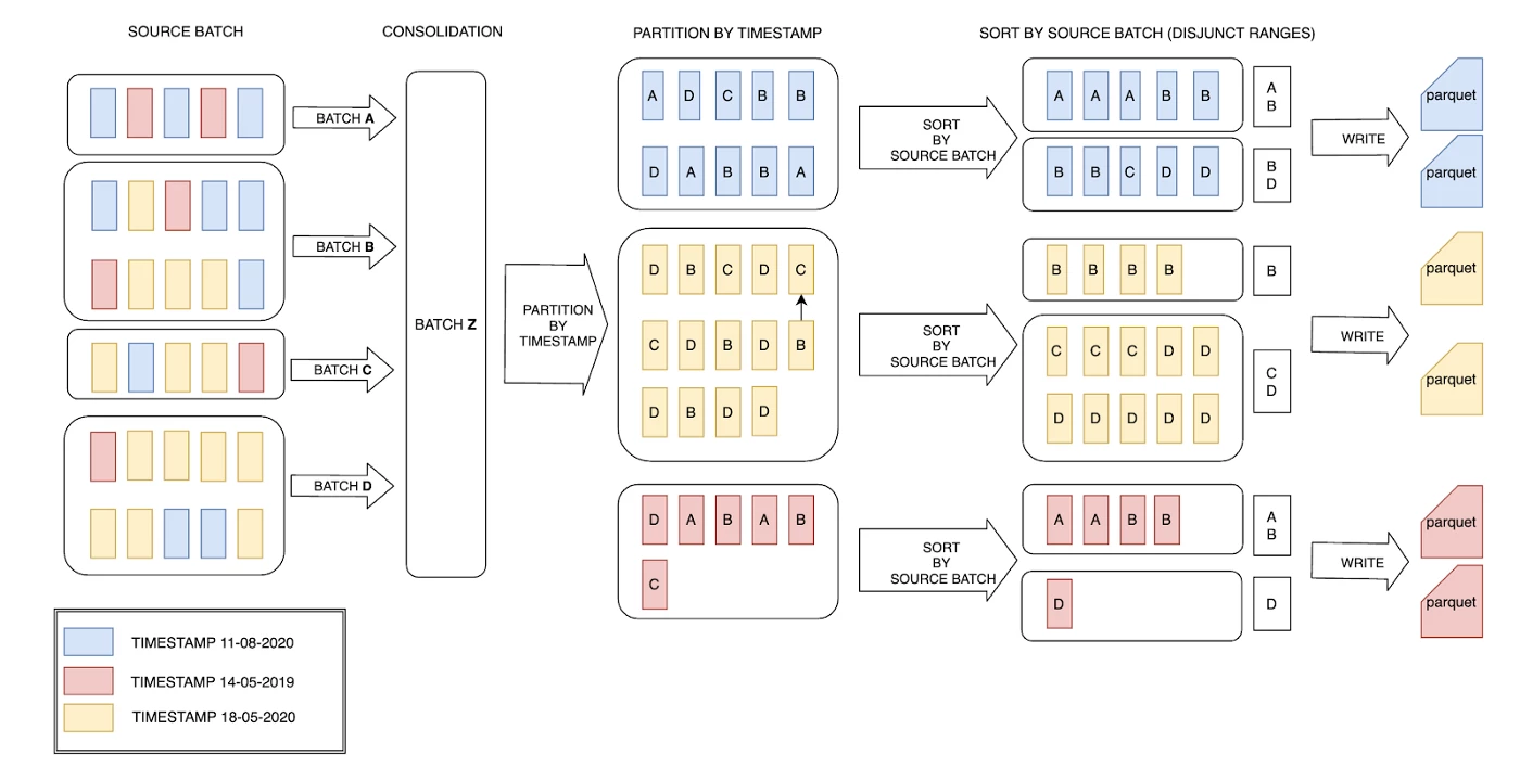 timestamp). - Data is sorted by source batch in each of the timestamp partitions. These source batch values are employed at a later stage to delete or restate the data.