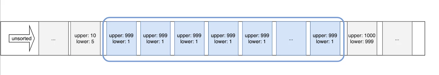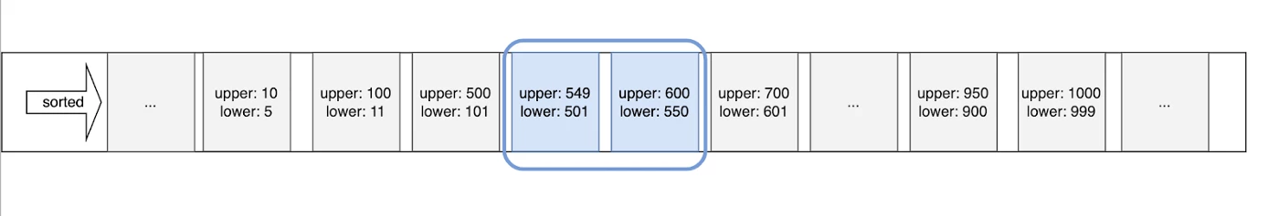 Consider the example of vacuuming ALL tombstones with values from 501 to 600. The sorting guarantees the upper and lower bounds of the tombstone column remain disjunct across the data files.