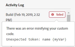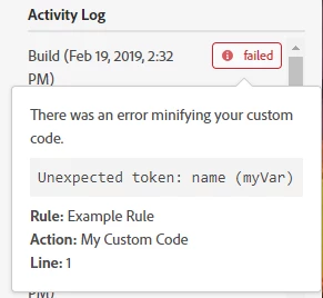 Right now the minification process when building just returns if there was an error and the error itself, but no context around what code is causing it. This makes it hard to debug since there is no way to search all custom code in Launch; users instead have to go rule by rule to find the error.