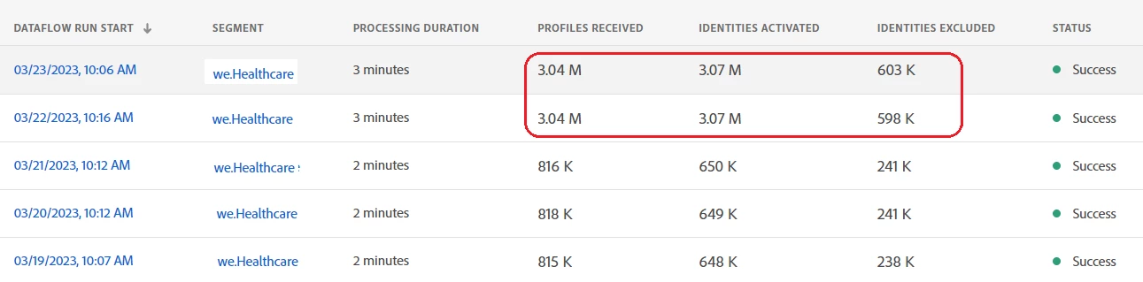 In AEP destination dataflow, I have observed that the total count of Identities Activated > Profile received (see screenshot below).