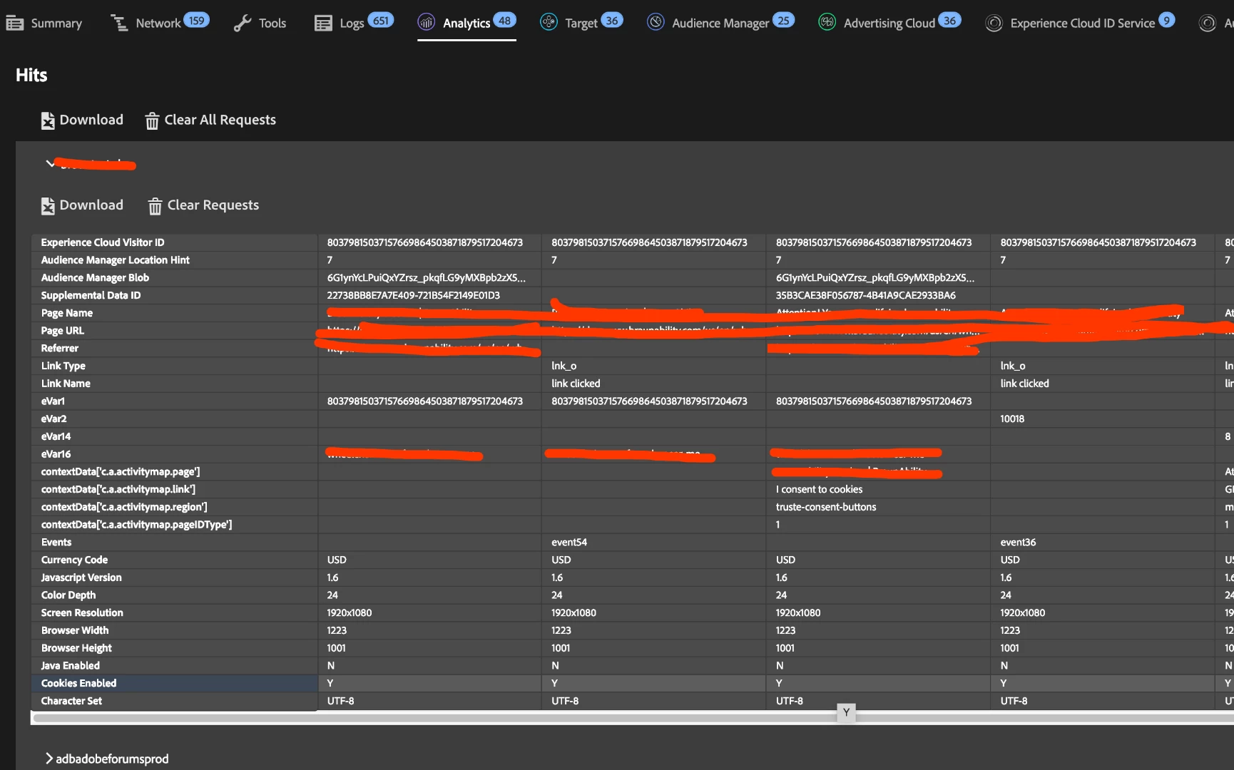 I am deploying Adobe Analytics in Launch for my client. I encounter a weird problem. Take look at the column 2 and 3 in above image. Column 2 coming from a global rule (set evar 1 and evar 16), which I trigger the s.t() function to send beacon and clear variable. Column 3 coming from "Consent Cookie" rule (Only set event 54 without evar 1 and evar 16) which I trigger the s.tl() to send beacon.