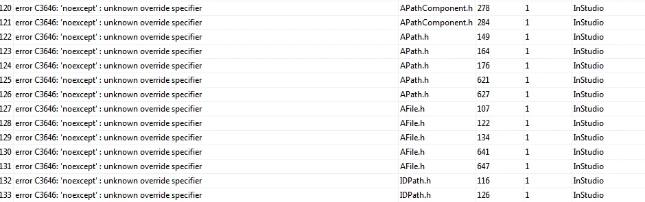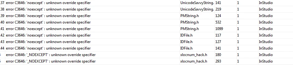error C3646: 'noexcept' : unknown override specifier c:\program files\adobe\adobe indesign cc 2017\plugin_sdk_081\plugin\source\publicincludes\ UnicodeSavvyString.h