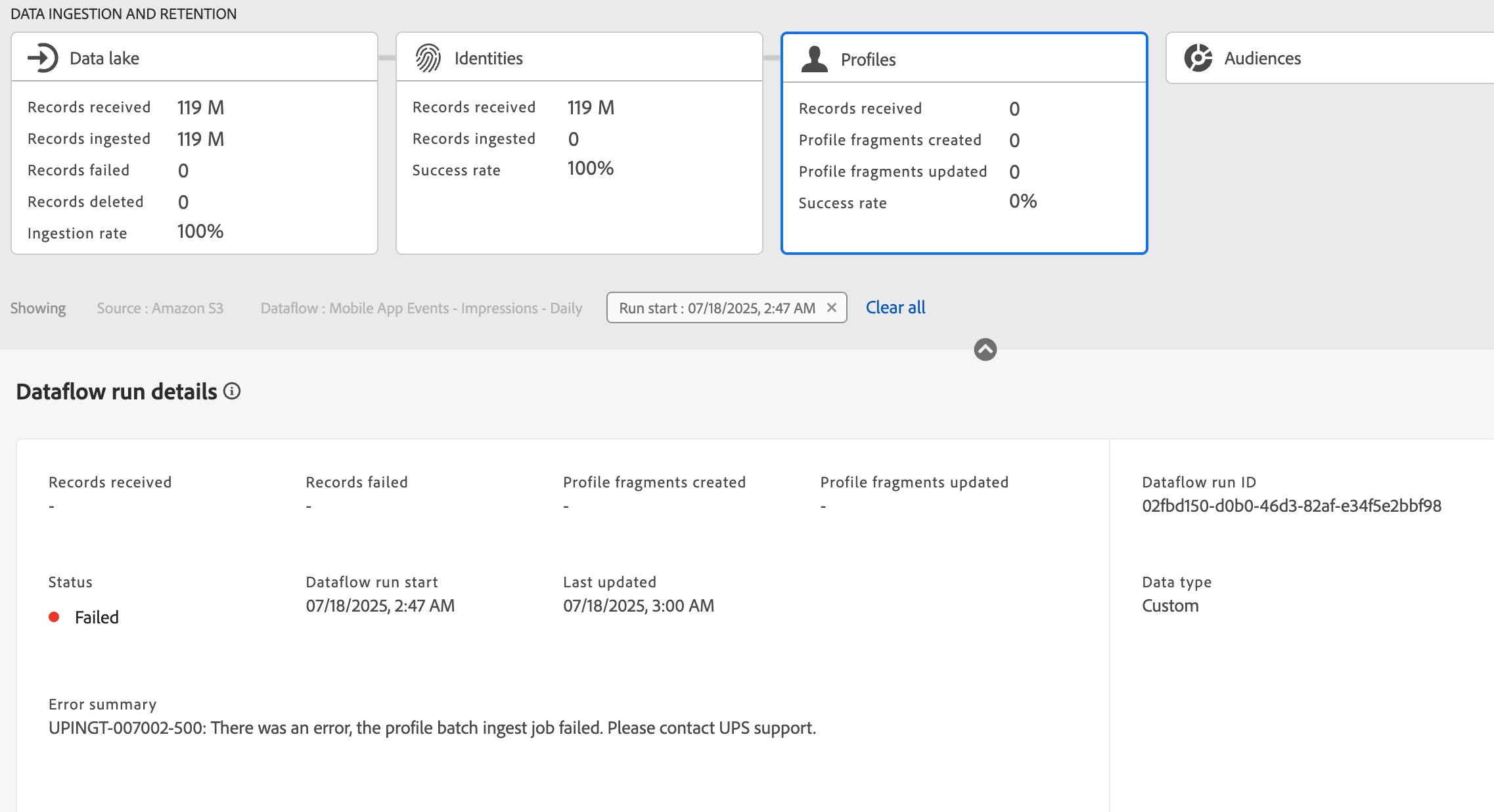 "UPINGT-007002-500: There was an error, the profile batch ingest job failed. Please contact UPS support" for most ingestion errors. This error summary is too generic for Developers to take action on before contacting Adobe support.