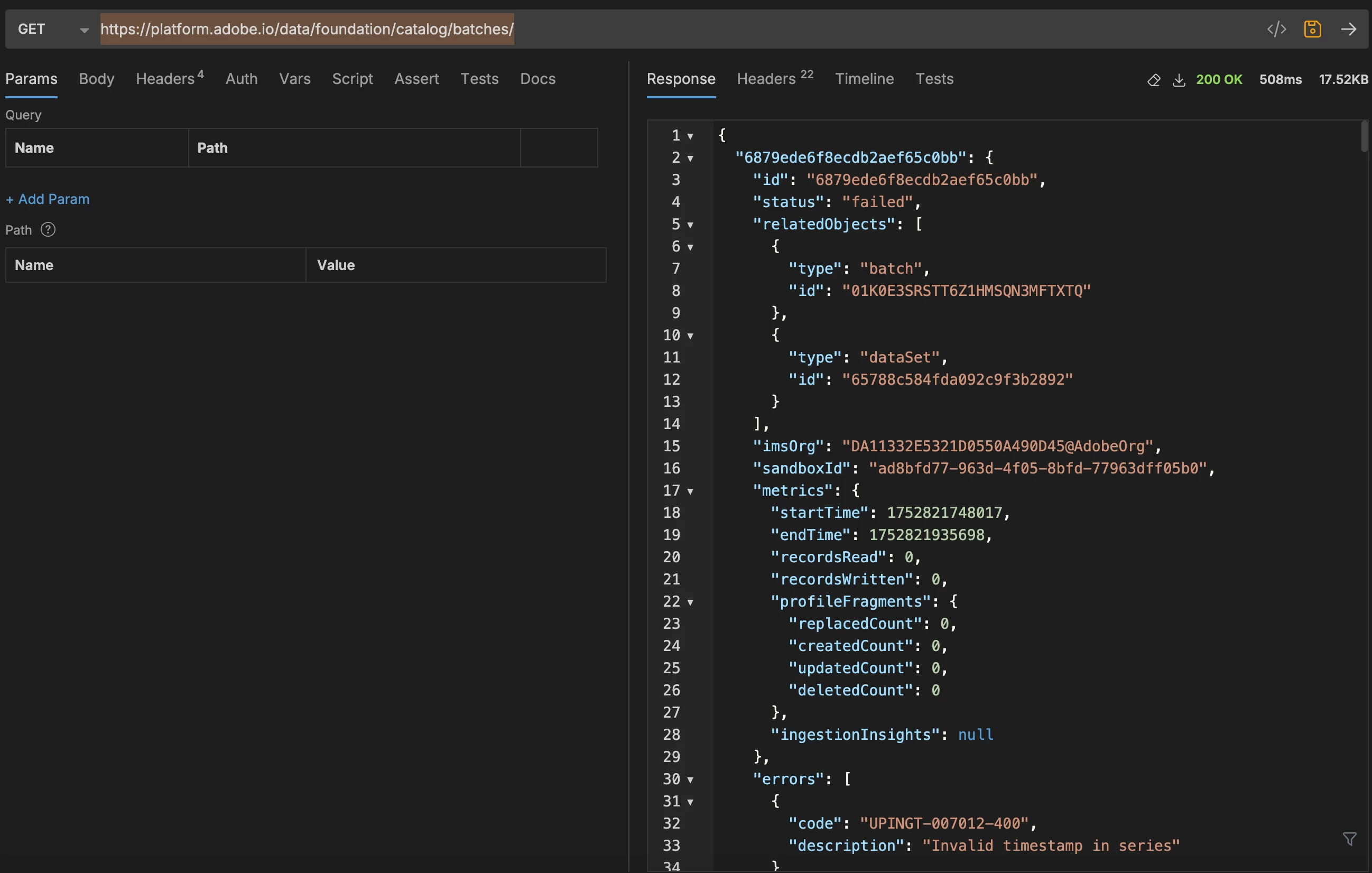 How would you like the feature to work - A slightly more helpful error code can be found with the catalog API at the batches/ GET endpoint under the "errors" object array, and the payload also displays the corresponding batch ID when that error occurred. So instead of current behavior, displaying the error from the error array.