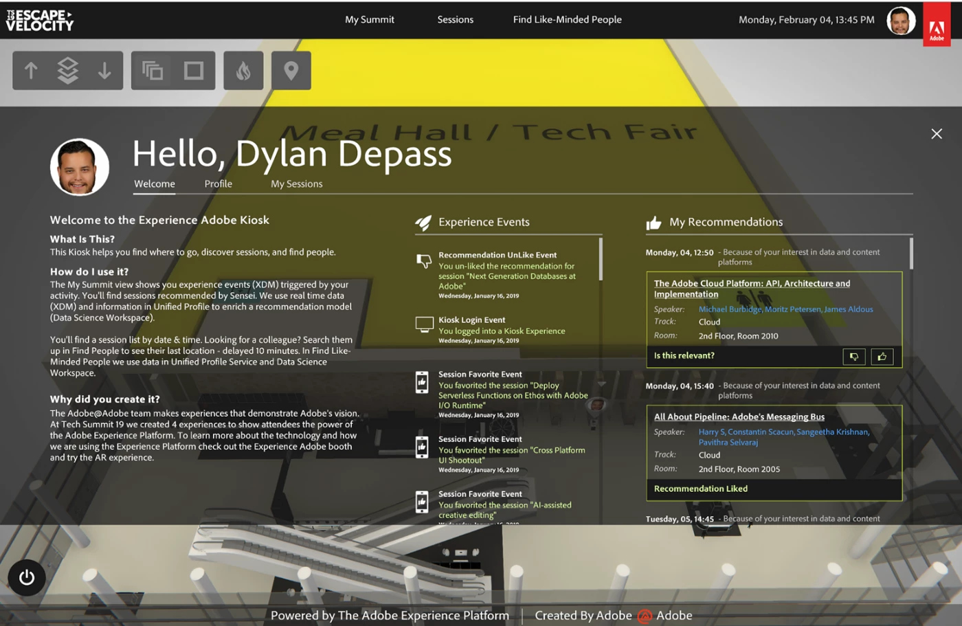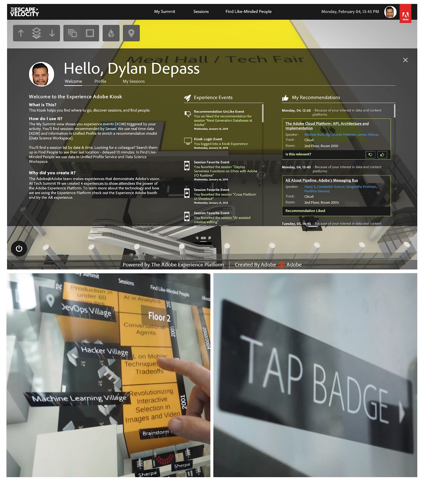 Mobile app: With the Adobe Tech Summit app, attendees would be able to browse sessions on-the-go and consult information on the speakers. They could also ‘like’ a session, which would create an “Experience Event” in their Profile and used to fuel future recommendations (shown on the Kiosk).