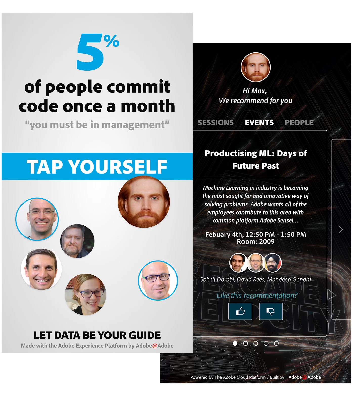 Using that segment, Experience Platform would find common data between the five Profiles and generate a statistic. This was to draw the attendees in and invite them to tap on the enlarged photo of their face to see personalized recommendations for sessions, events, and people.