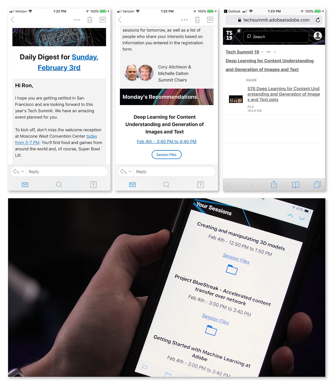 Prospector: This would deliver a hyper-personalized daily digest email for attendees based on which sessions they attended and/or liked, along with links to the session slides and assets stored in Adobe Experience Platform. Prospector would also send push notifications to the mobile app at specific moments in the attendee’s journey, such as welcoming them to a session when they enter the room.