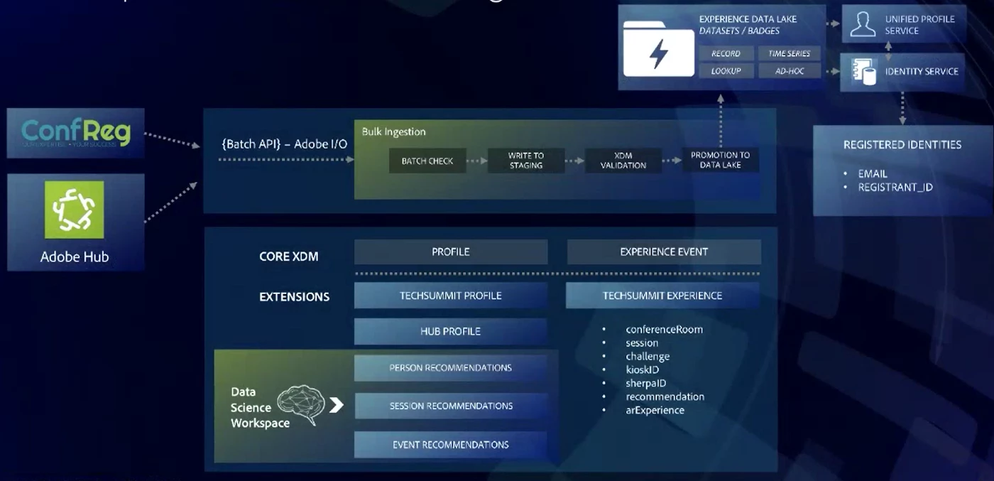 Real-Time Customer Profile was pivotal to pull off the entire Tech Summit. It’s where attendee data was pulled in from multiple sources and centralized in Adobe Experience Platform to create a 360-degree view of the attendee. This happened in real-time to provide targeted and personalized experiences at just the right moment.