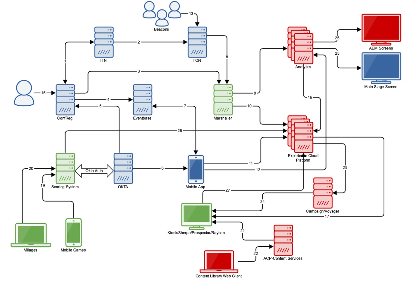With the Real-Time Customer Profile up and running, we were able to translate attendee attributes into useful and personalized content at the right time using the Kiosk, Sherpa screens, Prospector, and AR Rayban (see diagram below).