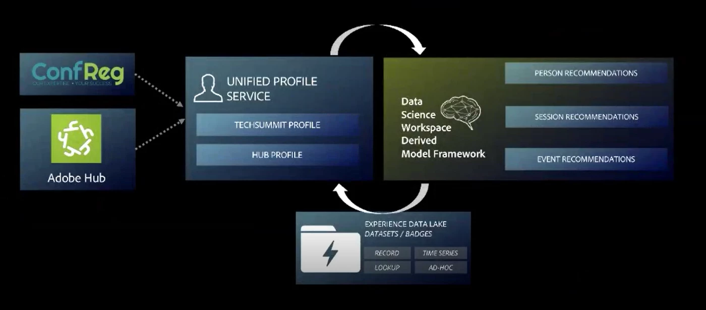 As shown in the diagram, Experience Platform pulled attendee data into the Profile, which enabled the Data Science Workspace to generate recommendations using three models: people, sessions, and events.