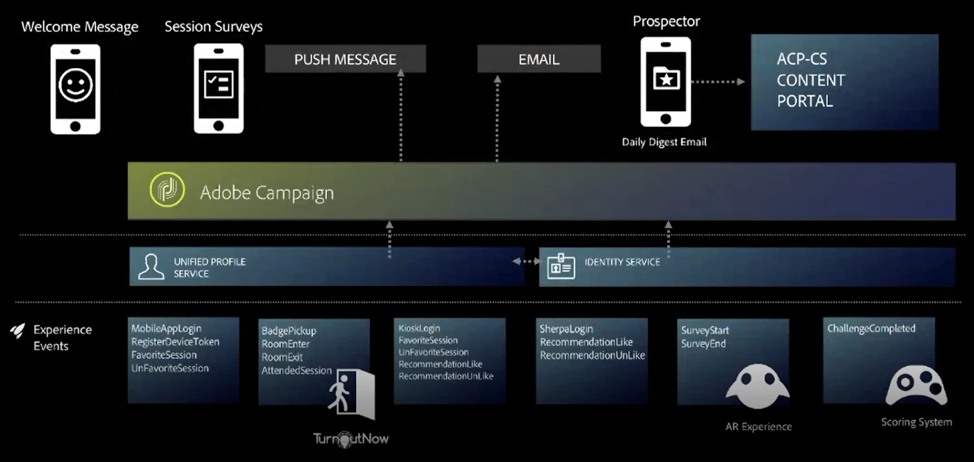In the diagram (shown above), Experience Events would stream in from our other experiences and create a journey for the attendee. With Adobe Campaign on Platform (ACOP), which allows real-time orchestration using contextual data, Experience Platform would then send a push notification (if enabled) or an email.