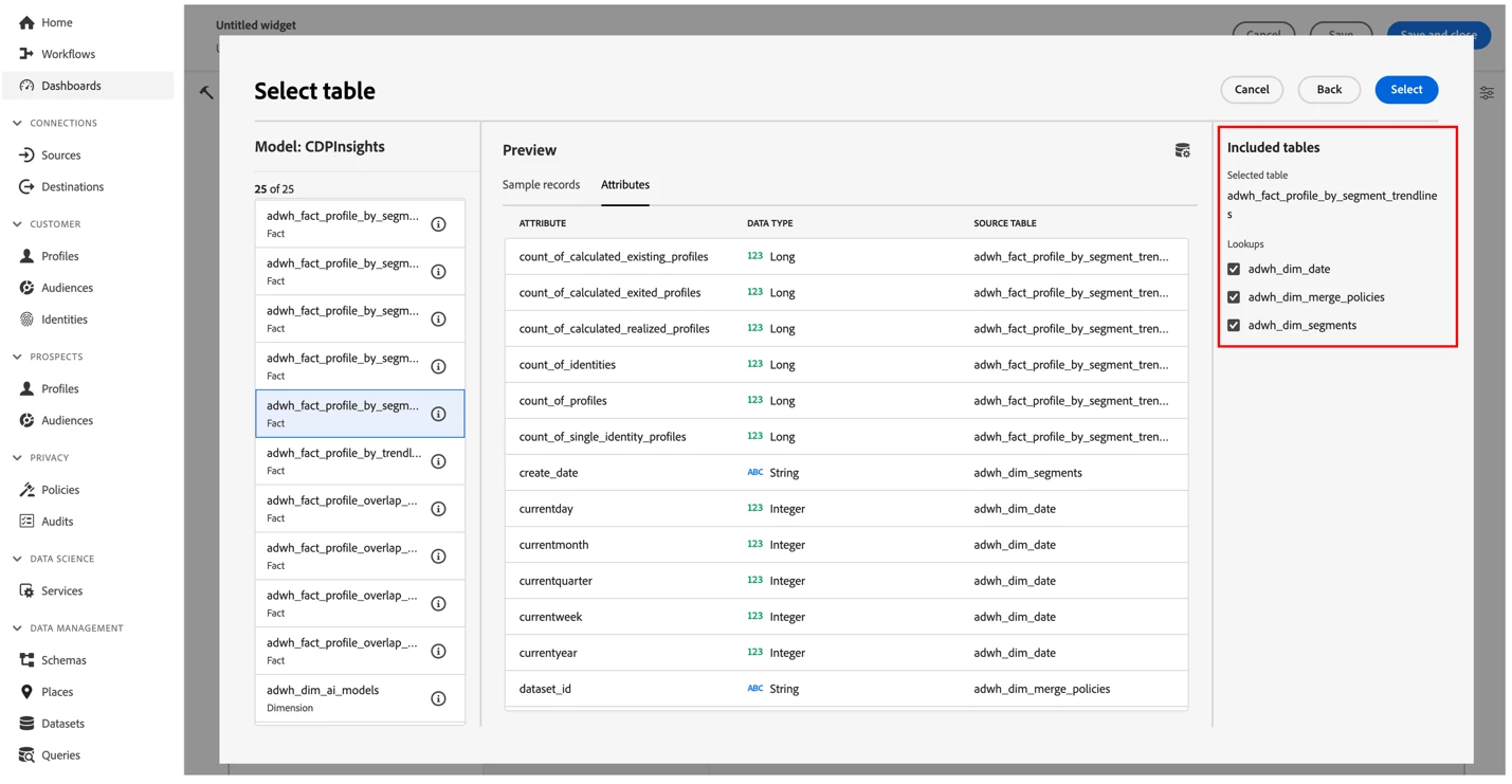 - Review all the available data models and the respective tables to use via dashboard widget creation flow.