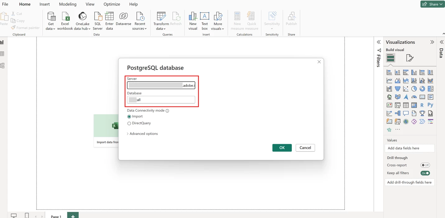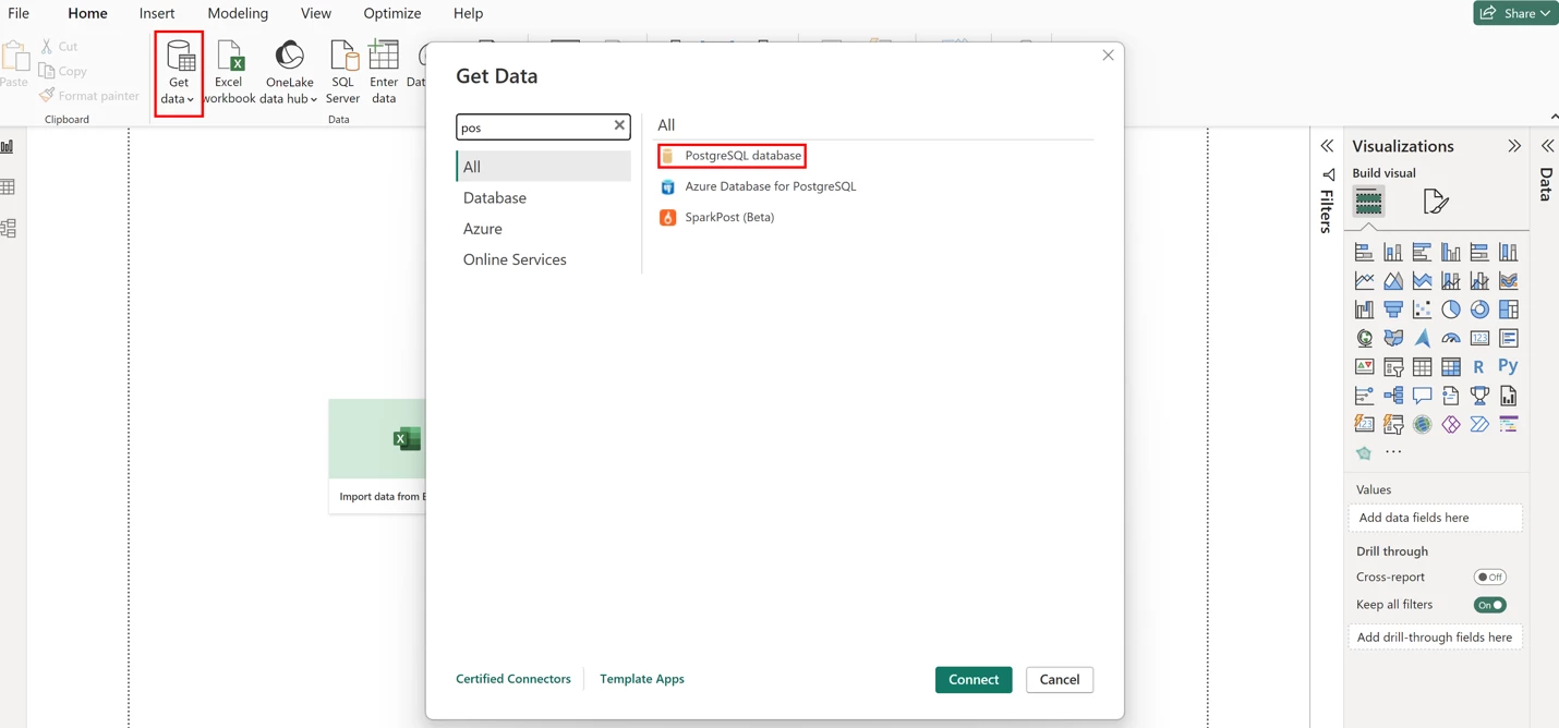 For this step, I will be using Power BI desktop. Once you open Power BI hit “Get data” and select “PostgreSQL database” and hit “Connect”
