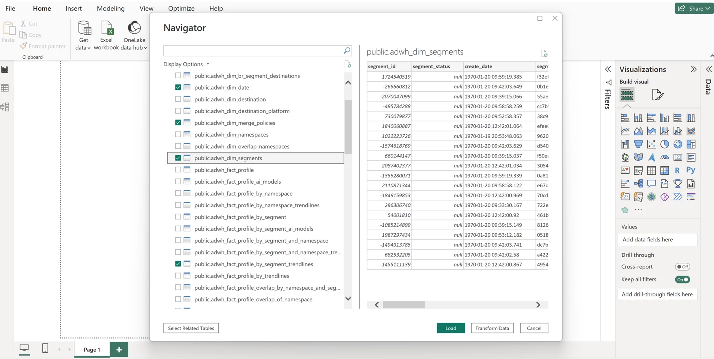 While Power BI might also display additional tables not surfaced in Step 1, it is recommended not to select those tables, as they might not be optimized for reporting and analytics needs. Refer to Data Distiller examples for guidance on how you can add additional insights to data models.