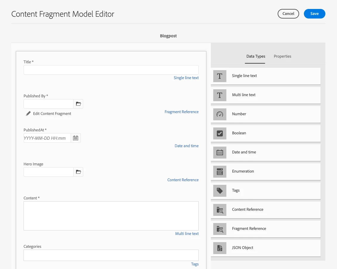 For this example, we prepared some models and fragments in the content package within the extension repository which you can add to your project. Be aware that because the GraphQL schema exposed by the Adobe Experience Manager GraphQL endpoint relates directly to the Content Fragment models, any change in the models needs to be considered in the frontend code as well. You can access the Content Fragment model editor via the Tools menu within Adobe Experience Manager.