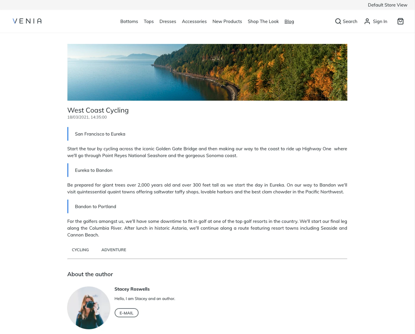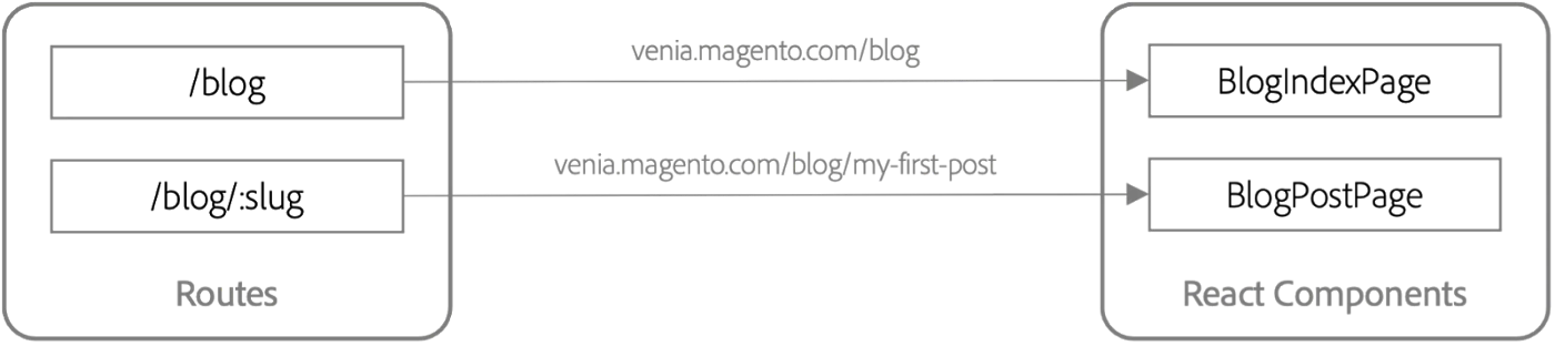 BlogIndexPagewhich takes care of showing a list of all recent blog posts and another component calledBlogPostPage, which displays the full version of a single blog post. The extension uses the PWA Studio extensibility framework to register two routes that point to these two components. The registered routes are: