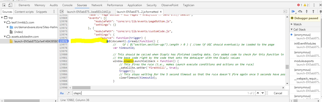 6) put a break point on the "$(document.ready(function() {" line of code, which is a few lines above the first instance of olapic (see yellow highlighting in the screen shot below)