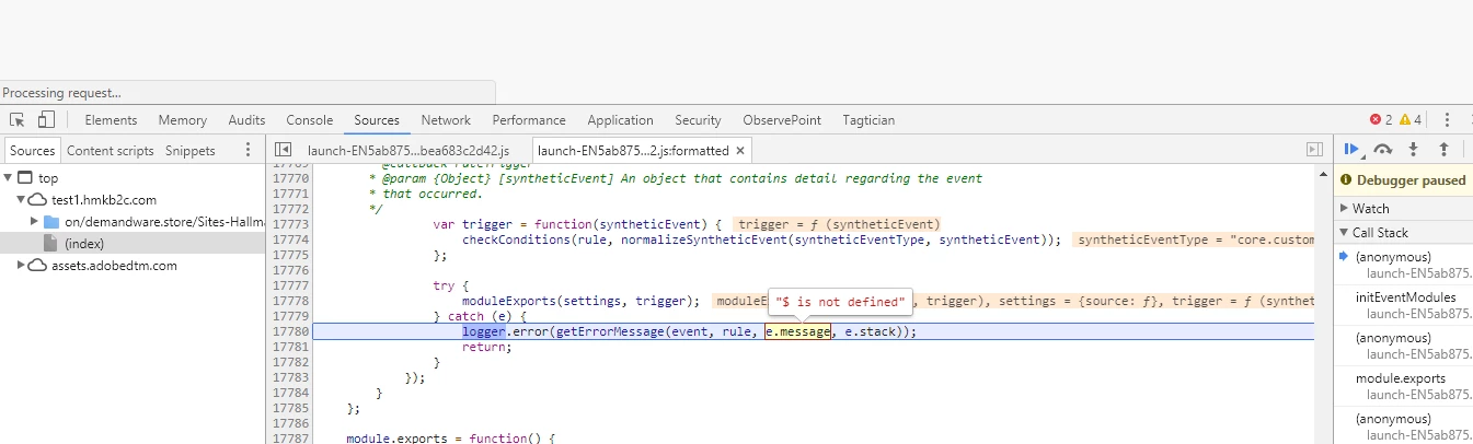 I am getting an error in my Custom Event Code saying that "$ is not defined" Below are steps to put in a break point to see the jquery error as well as steps on where to find the Custom Event Code within my web property in Launch.