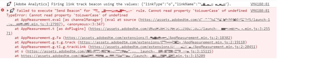 Launch & Analytics: Failed to execute "Send beacon" - Cannot read property 'toLowerCase'