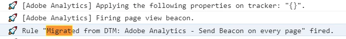 At the same time, the rule "Migrated from DTM: Adobe Analytics - Send Beacon on every page" is fired and sent the beacon without the same error message.