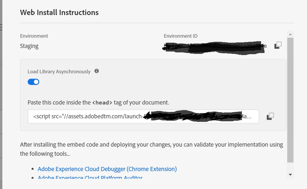 <script type="text/javascript" src="//assets.adobedtm.com/launch-XXXXXXXXXXXXefa8708c805e3XXXXXXX-staging.min.js" async></script>