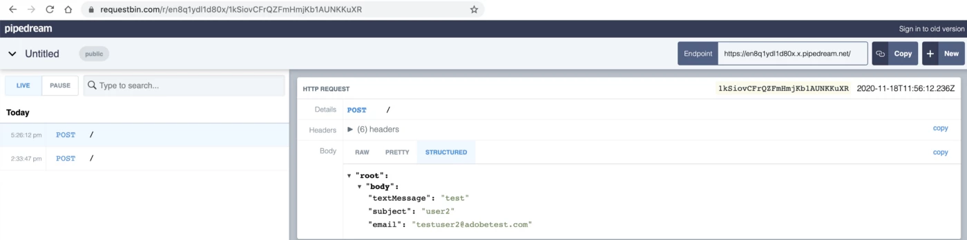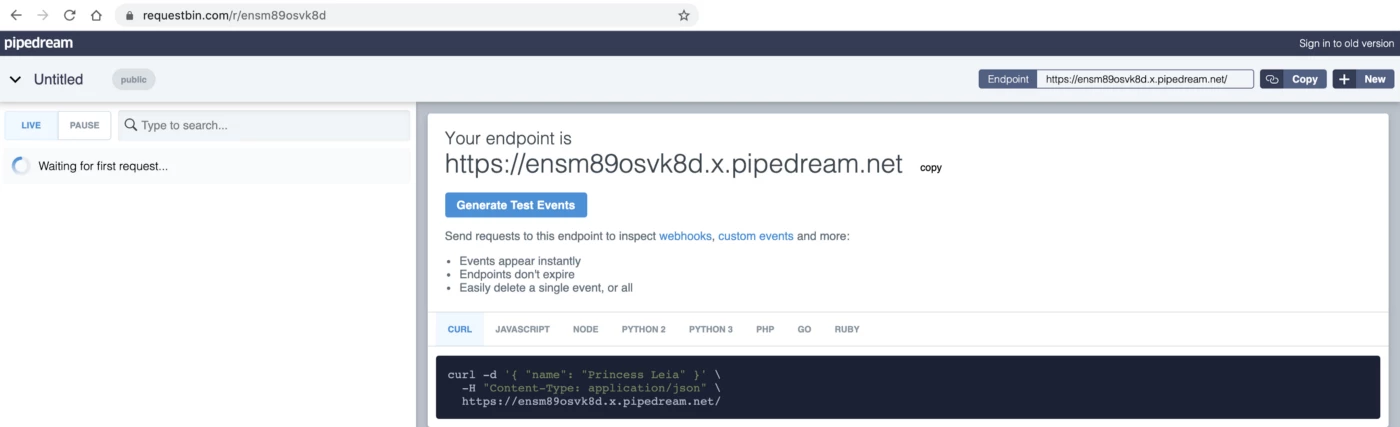 Firstly, visit any external endpoint simulator like RequestBin to create a public endpoint to simulate integration with an external data platform.