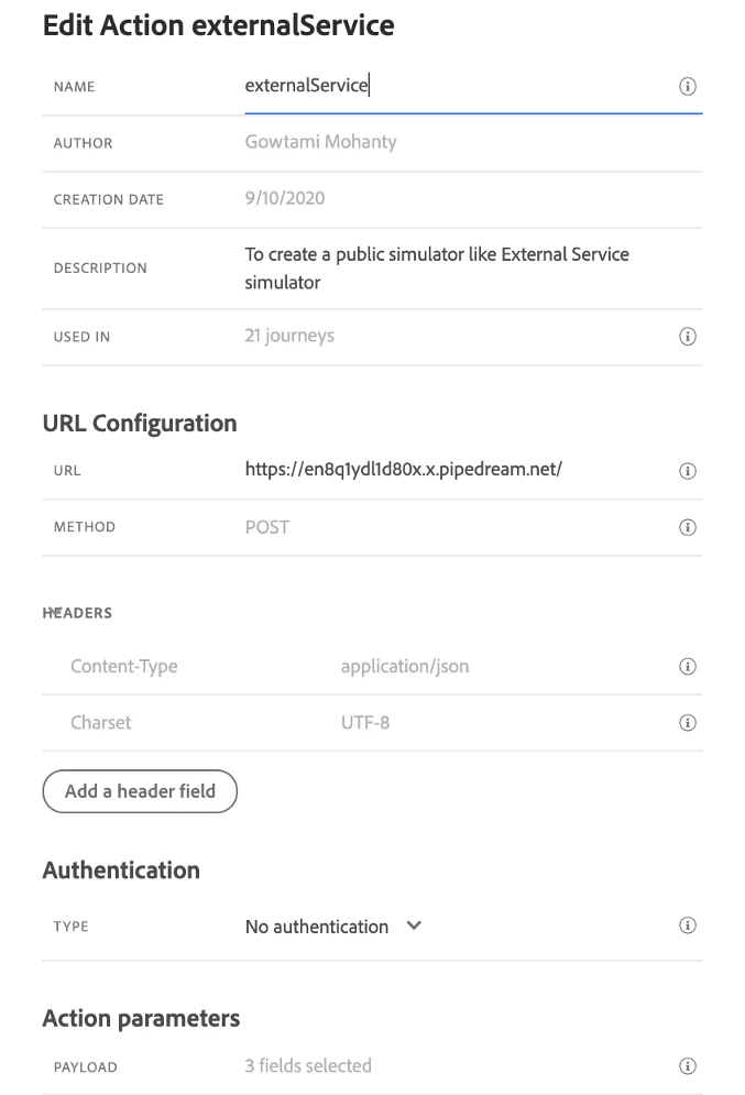 Create a new Custom Action with the endpoint details we generated in the above step. As it is a public endpoint, select No authentication and select the information fields which you would like to share with the external platform. For sample payload, refer here.