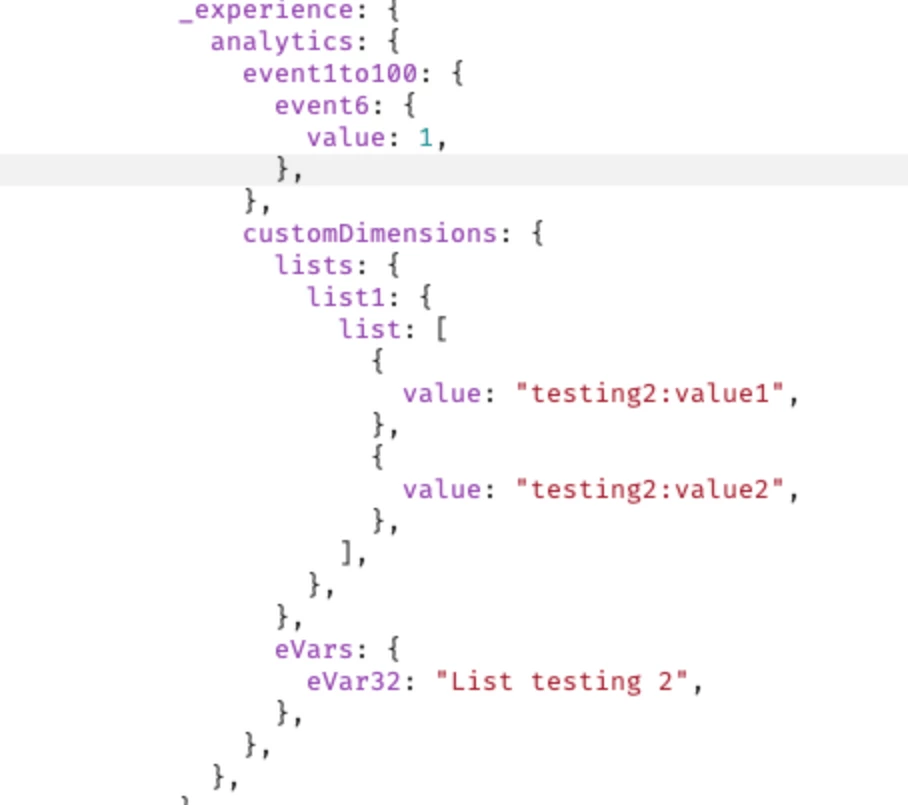 _experience.analytics.customDimensions.lists.list1.list = [ { value: 'a' }, { value: 'b' } ... ]