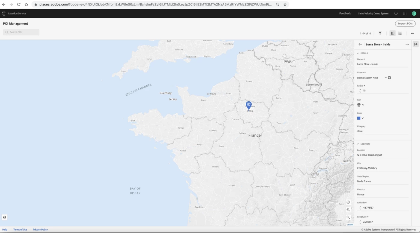 Create one or many Point of Interest, within Adobe Experience Platform Places Services user interface. A point of interest (POI) is a location or a point on a map that is of importance to your organization or company. It can include locations like cafes, restaurants, retail locations, stadiums, and so on. Companies can define points of interest to help personalize a user’s mobile experience when they have entered a geo-fenced region for a particular point of interest. Beyond personalized experiences, companies may also create points of interest to help them analyze and better understand location traffic patterns. A large retail chain may choose to create POIs for all of their store locations to gain analytics on users that have their mobile application AND visit a store location.
