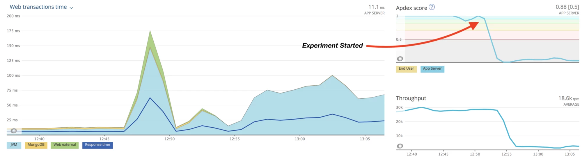While up to this point everyone worked together at one scenario, the last exercise was of a different format. The team was divided into two parts: blue and red. The red team was brought into a separate room, where they started the next experiment. The blue team was left alone, not knowing which failures were introduced into the system. The task for the blue team was to identify the problem just with existing run books, alerts, and monitoring tools and propose a valid solution to the problem. The problem itself–a slow network connection to a downstream service–was identified by the blue team after about 10 minutes. The failure itself didn't cause any unexpected side effects, but we concluded that having an aggregate service dashboard showing all of our monitoring tools would help us locate issues faster.