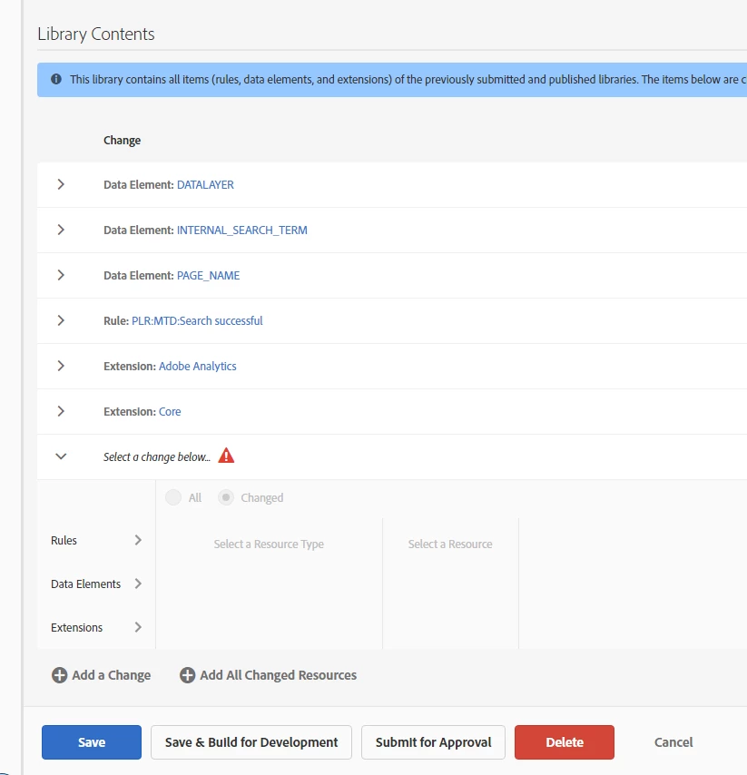 If you add a change in the Library Contents, then forget to delete or fill it and try to save the library, the upcoming error sign is kind of small. The error sign is just near the unfilled change ("Select a Change below"), but the blue bar below the head "Library Contents" ("This library contains...") ist much more visible. Thus you won't directly understand wich error appeared or why you can't save.