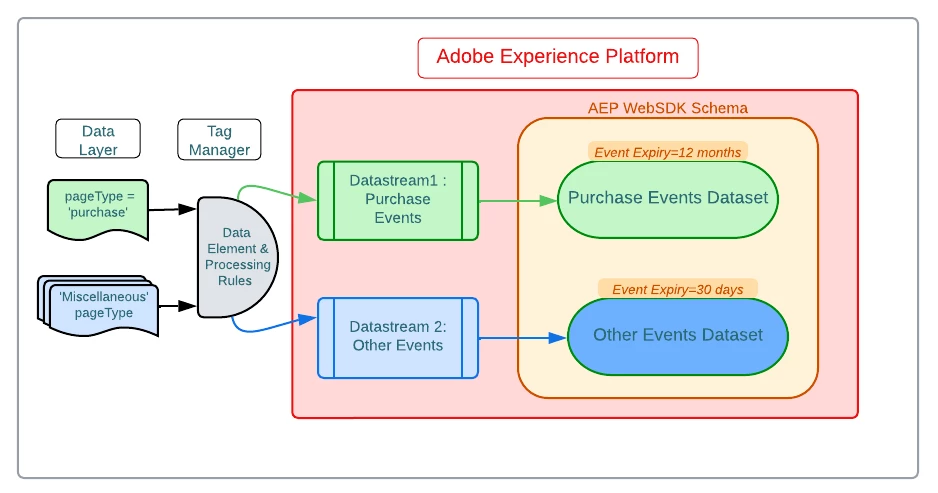 Customers often associate different weightage and relevance to different event-types and want to assign different expiry duration for them. An example would be choosing ‘30 days’ retention for ‘page views’ and ‘product browse’ events compared to 1 year for ‘purchase’ events. This is achievable in a WebSDK implementation using two DataStream pointing to two datasets (purchase vs other events) and assigning different expiry duration to them. This blog walks through an implementation done for a leading department store group.