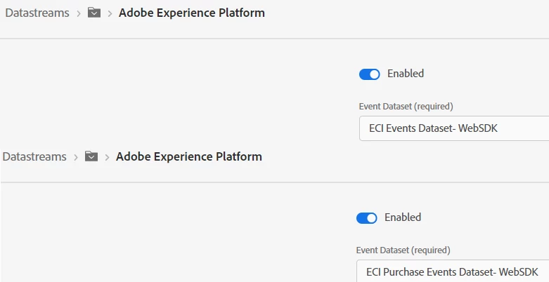 - 2 different datastreams pointing to their respective AEP profile-enabled datasets